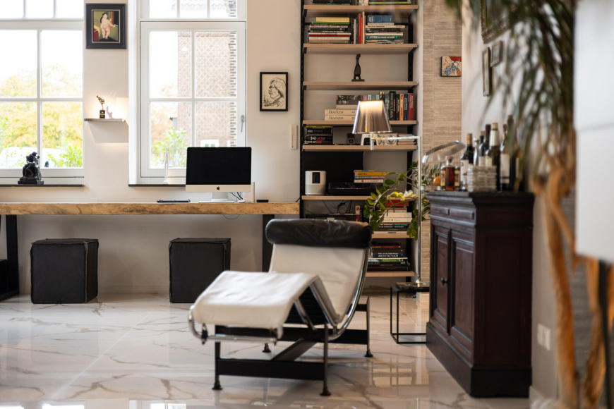 Het interieur combineert een rustige uitstraling met een tot in de perfectie uitgevoerde afwerking (2023). De vloeren van Italiaans composiet met een marmer-look en vloerverwarming/-koeling lopen door in alle vertrekken en zijn zo gelegd dat er een hele prettige akoestiek is. De wanden zijn afgewerkt met vliesbehang en deels voorzien van een luxe leerbehang in woonkamer en keuken en een subtiel steentjesbehang in de slaapkamer, wat de ruimtes een warme en verfijnde uitstraling geeft.