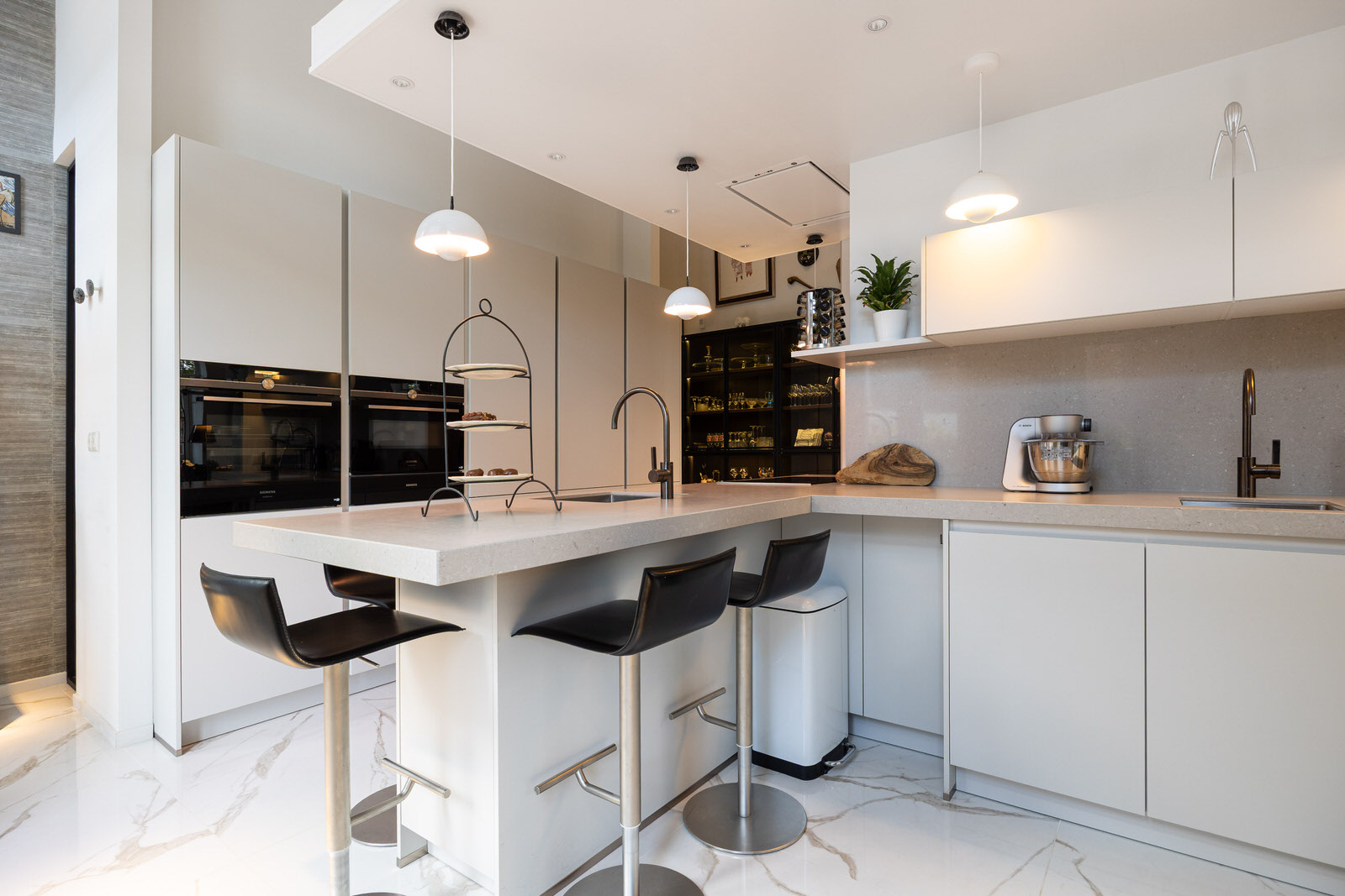De keuken is uitgevoerd in lichte, moderne kleurstellingen en voorzien van hoogwaardige inbouwapparatuur. Het ontwerp combineert esthetiek met functionaliteit en bestaat uit een T-vormig kook-/spoelgedeelte met een royale bar, een composiet werkblad en een aparte kastenwand.