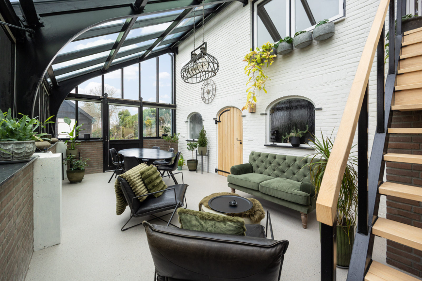 Vanuit de keuken is er zicht op de orangerie, een mooie multifunctionele ruimte op tuinniveau. Het witgeschilderde metselwerk met halfronde ramen en de robuuste zwarte stalen spanten zorgen voor een fraaie uitstraling vol sfeer en karakter.