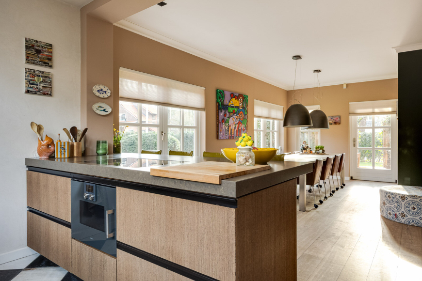 De woonkamer en keuken vormen het warme hart van het huis. Sfeervolle raampartijen rondom en openslaande deuren richting het theehuis en de tuin laten het groen als het ware naar binnen komen. In de woonkamer geven de visgraat parketvloer, hoge plinten, sierlijsten en de open gashaard in schouw de ruimte een klassiek karakter, gecombineerd met een recente schilderafwerking (2025) die de sfeer fris en eigentijds maakt