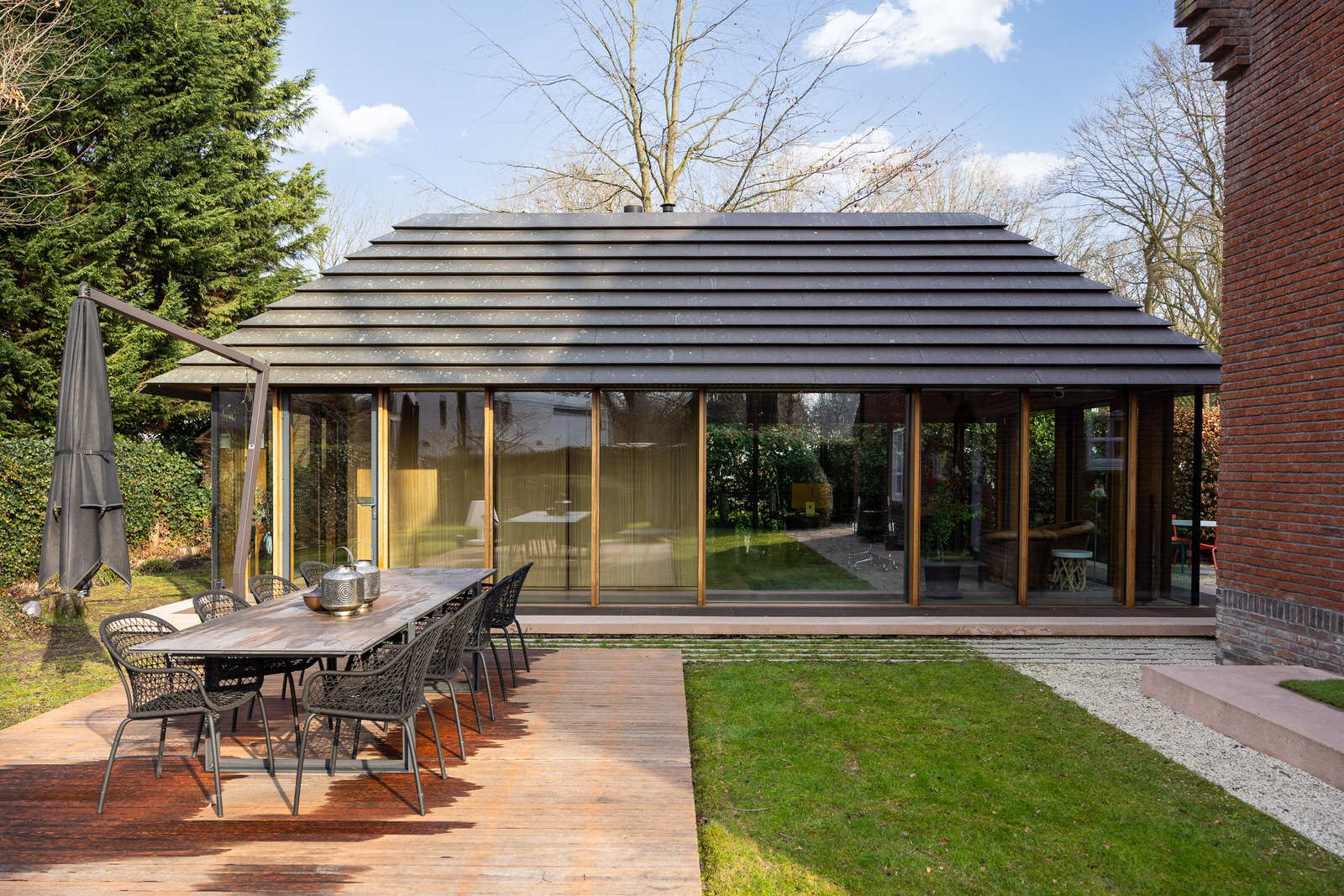 Het stalen en gecoate theehuis is direct tegen de woning geplaatst en vanuit zowel de keuken als de woonkamer goed bereikbaar. Met zijn gepigmenteerde betonvloer en infraroodverwarming vormt het een intieme, architectonisch ontworpen verlenging van het woonhuis, een plek om te lezen, te werken of simpelweg te genieten van het groen.